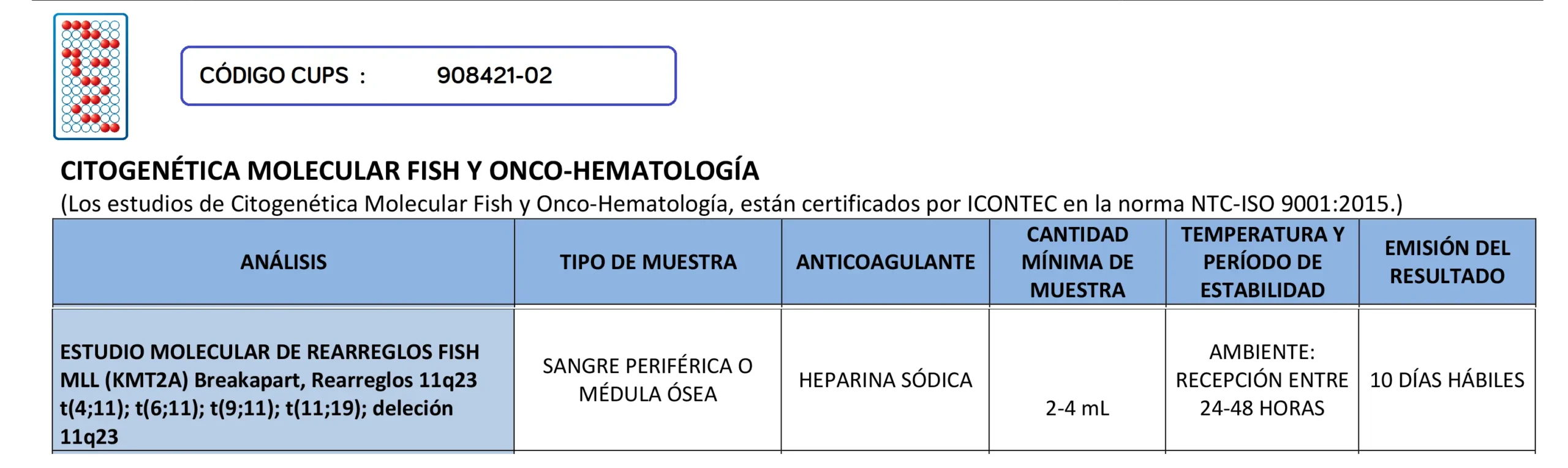 P11-2 ESTUDIO MOLECULAR DE REARREGLOS FISH MLL (KMT2A) Breakapart, Rearreglos 11q23 t(4;11); t(6;11); t(9;11); t(11;19); deleción 11q23 90.8.4.21-02