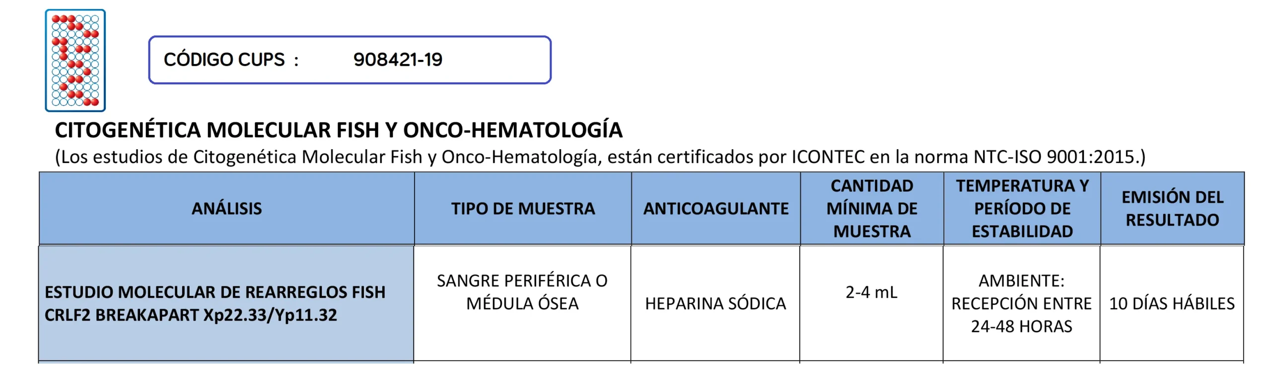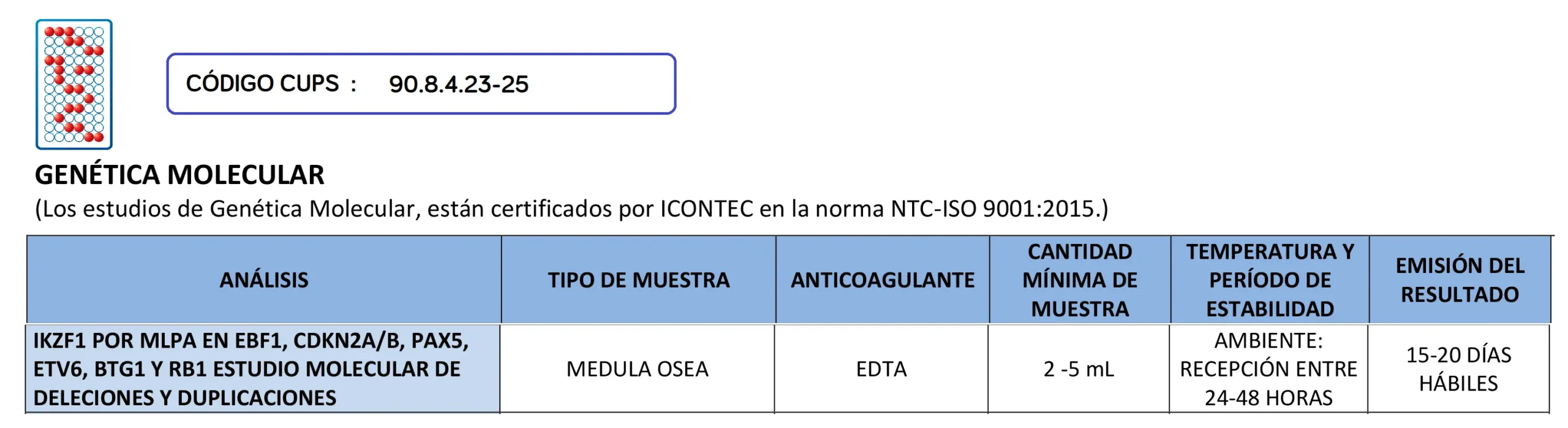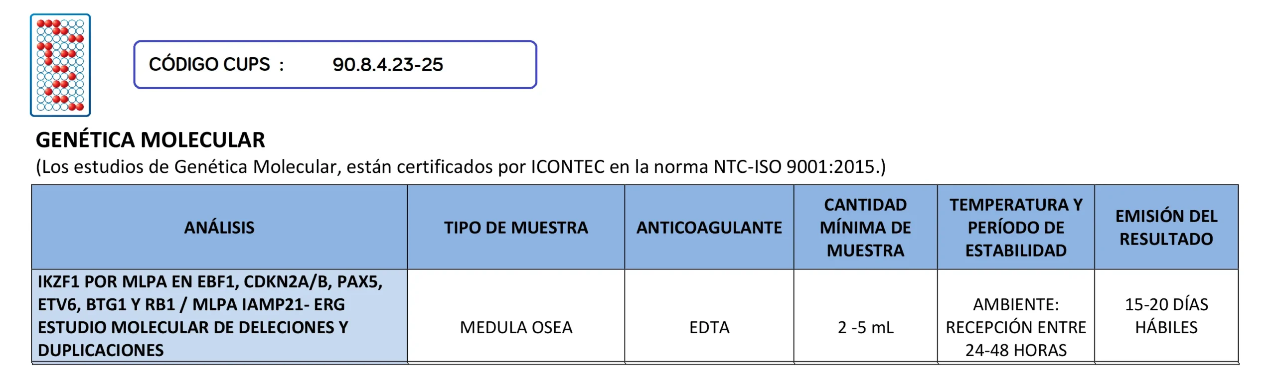 P32-1 IKZF1 POR MLPA EN EBF1, CDKN2A/B, PAX5, ETV6, BTG1 Y RB1 / MLPA IAMP21- ERG ESTUDIO MOLECULAR DE DELECIONES Y DUPLICACIONES 90.8.4.23-25