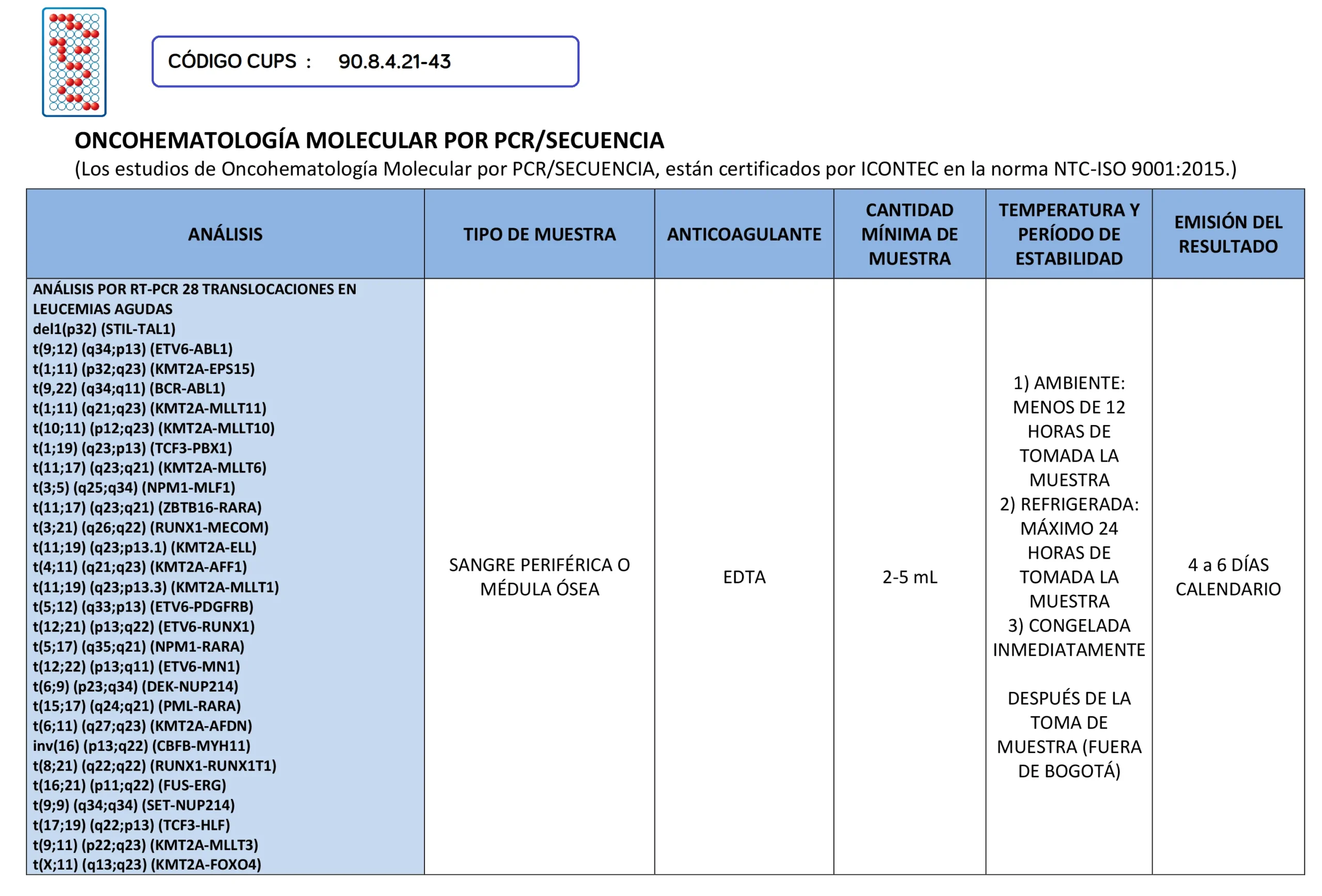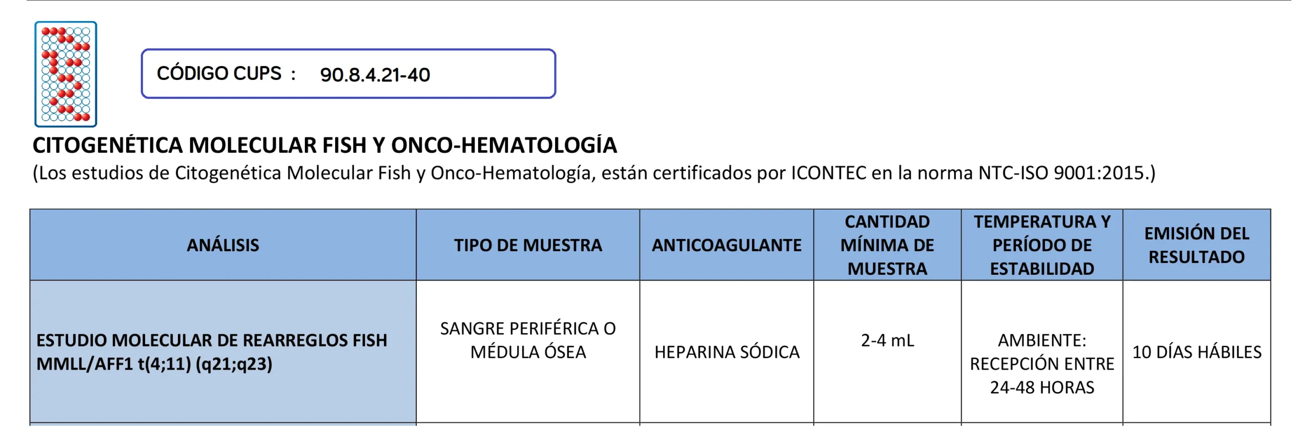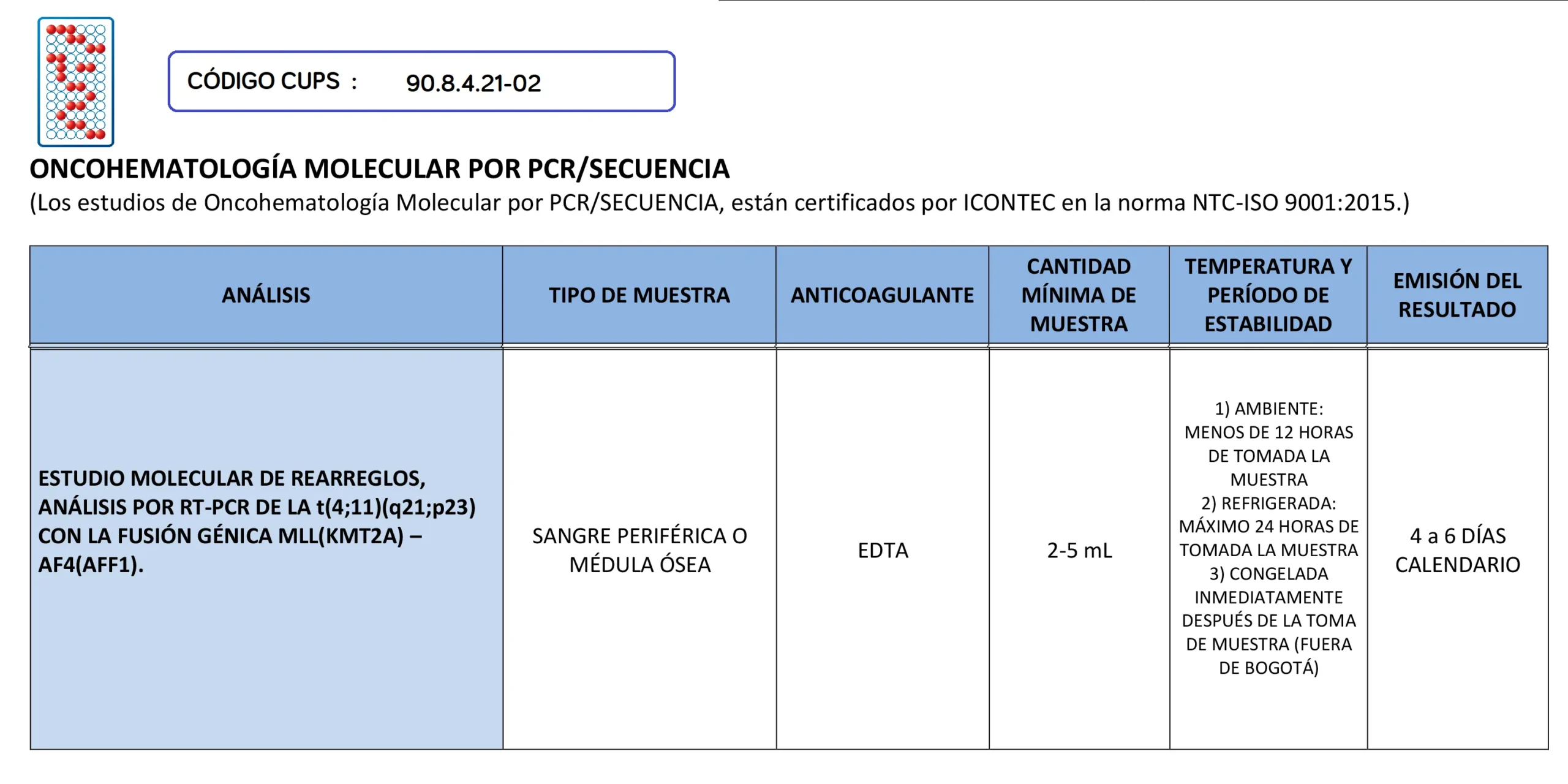P21-2 ESTUDIO MOLECULAR DE REARREGLOS, ANÁLISIS POR RT-PCR DE LA t(4;11)(q21;p23) CON LA FUSIÓN GÉNICA MLL(KMT2A) – AF4(AFF1). 90.8.4.21-02