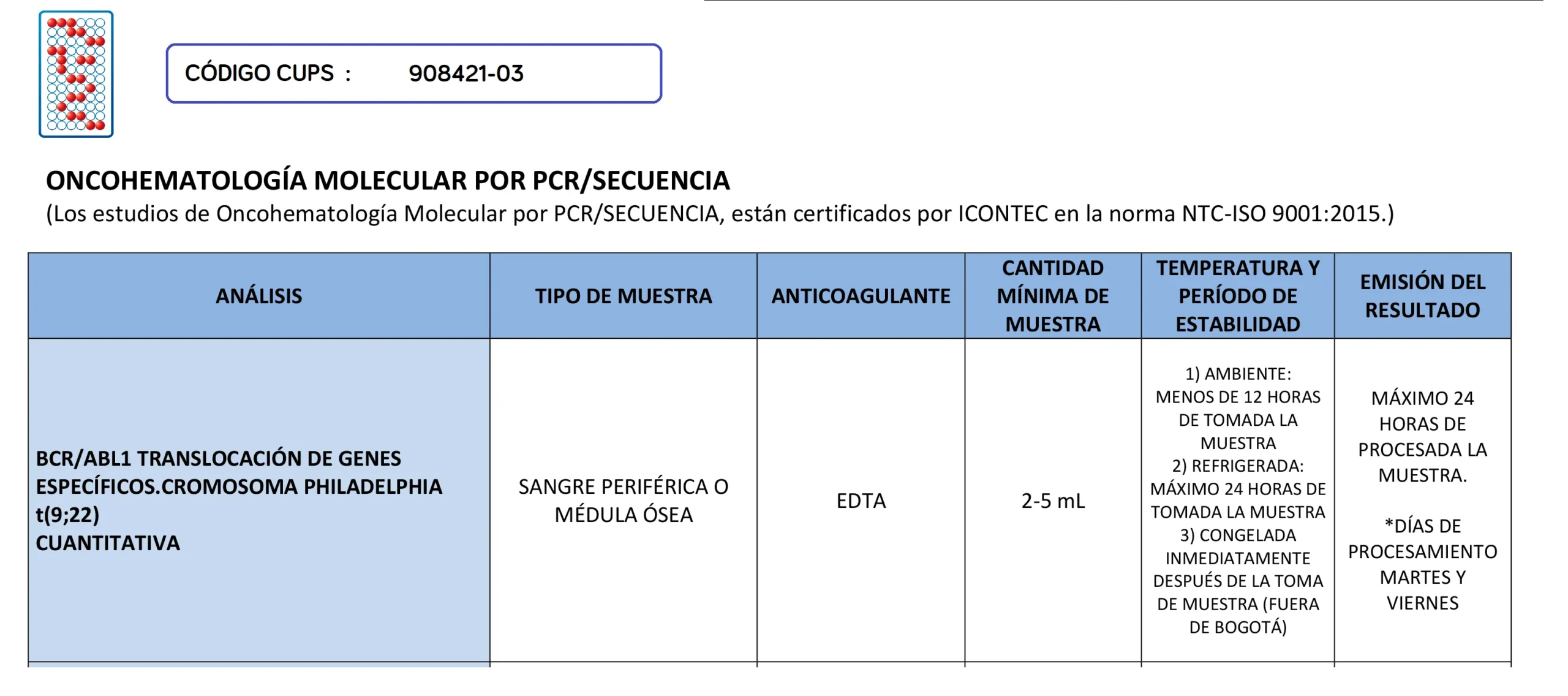 P19-1 BCR/ABL1 TRANSLOCACIÓN DE GENES ESPECÍFICOS.CROMOSOMA PHILADELPHIA t(9;22) CUANTITATIVA 90.8..4.21-03