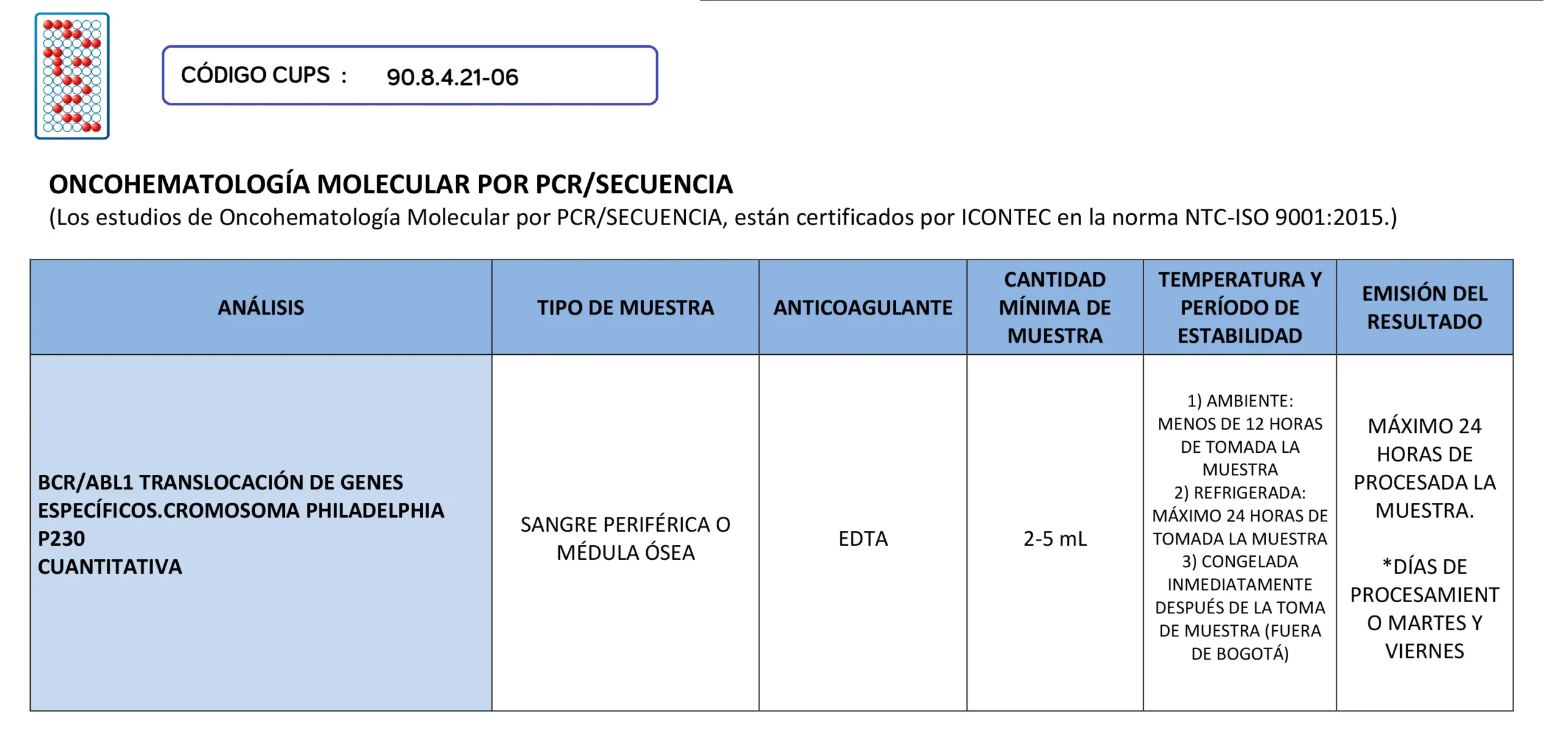 P20-2 BCR/ABL1 TRANSLOCACIÓN DE GENES ESPECÍFICOS.CROMOSOMA PHILADELPHIA P230 CUANTITATIVA 90.8.4.21-06