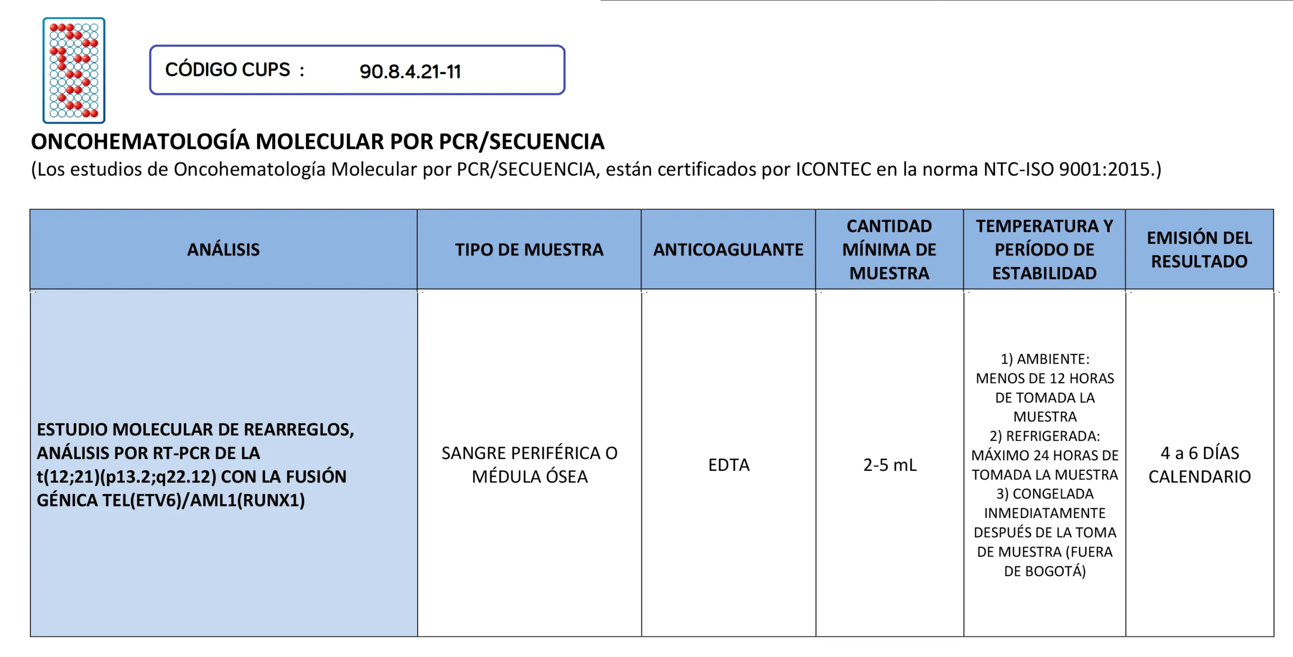 P22-2 ESTUDIO MOLECULAR DE REARREGLOS, ANÁLISIS POR RT-PCR DE LA t(12;21)(p13.2;q22.12) CON LA FUSIÓN GÉNICA TEL(ETV6)/AML1(RUNX1) 90.8.4.21-11