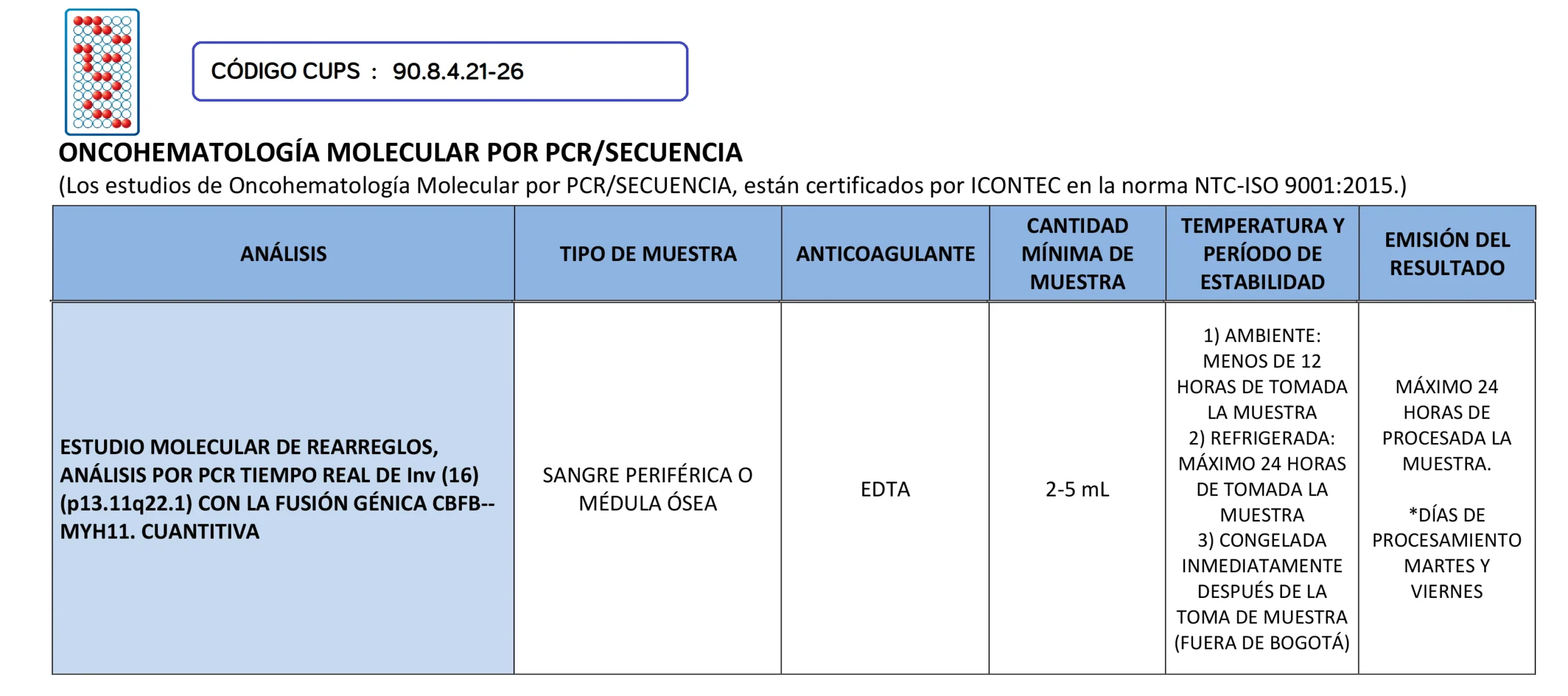 P23-2 ESTUDIO MOLECULAR DE REARREGLOS, ANÁLISIS POR PCR TIEMPO REAL DE Inv (16) (p13.11q22.1) CON LA FUSIÓN GÉNICA CBFB– MYH11. CUANTITIVA 90.8.4.21-26