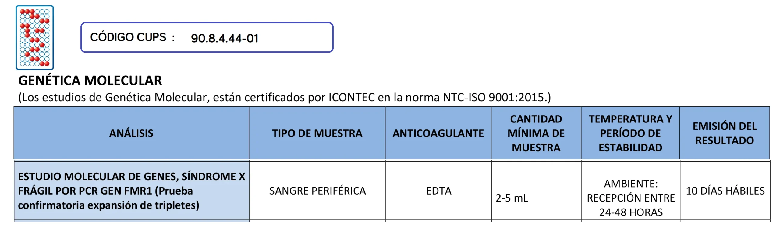 P32-2 ESTUDIO MOLECULAR DE GENES, SÍNDROME X FRÁGIL POR PCR GEN FMR1 (Prueba confirmatoria expansión de tripletes) 90.8.4.44-01