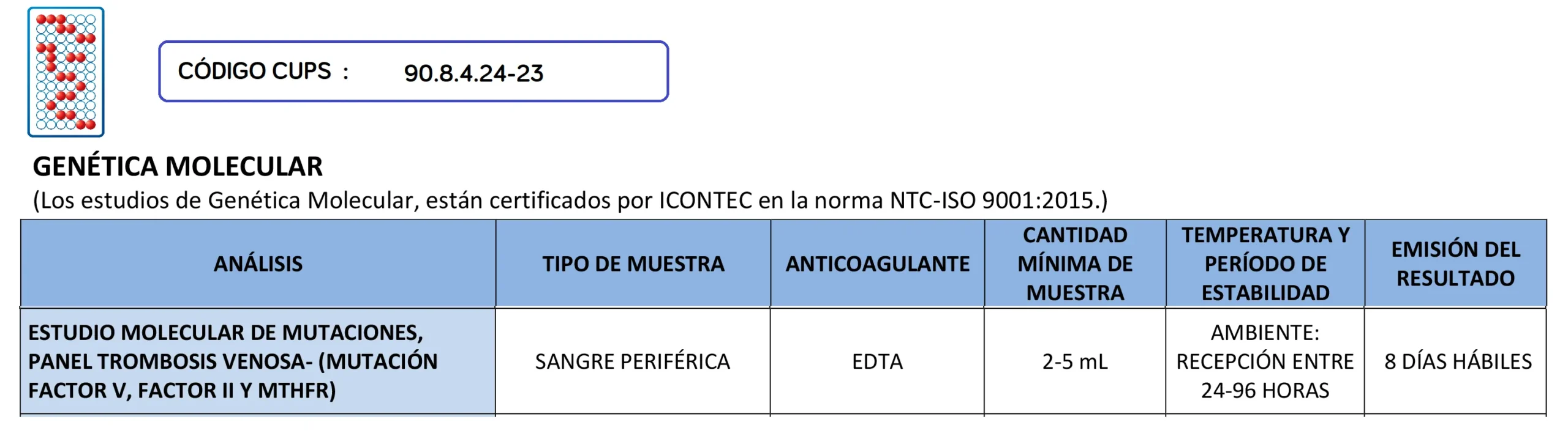 P33-3 ESTUDIO MOLECULAR DE MUTACIONES, PANEL TROMBOSIS VENOSA- (MUTACIÓN FACTOR V, FACTOR II Y MTHFR) 90.8.4.24-23