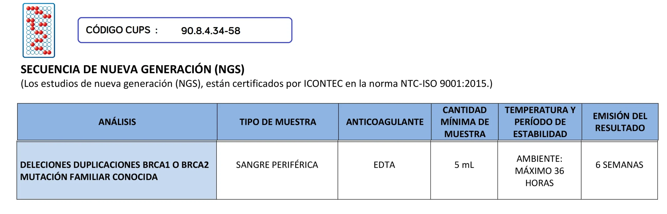 P36-1 ANÁLISIS POR SECUENCIA DE BRCA1 Y BRCA2 CÁNCER DE MAMA, INCLUYE PANEL COLOMBIA GRANDES DELECIONES Y DUPLICACIONES (NGS) 90.8.4.33-57