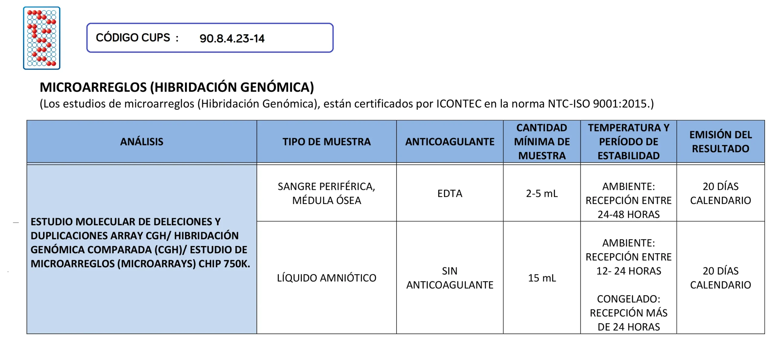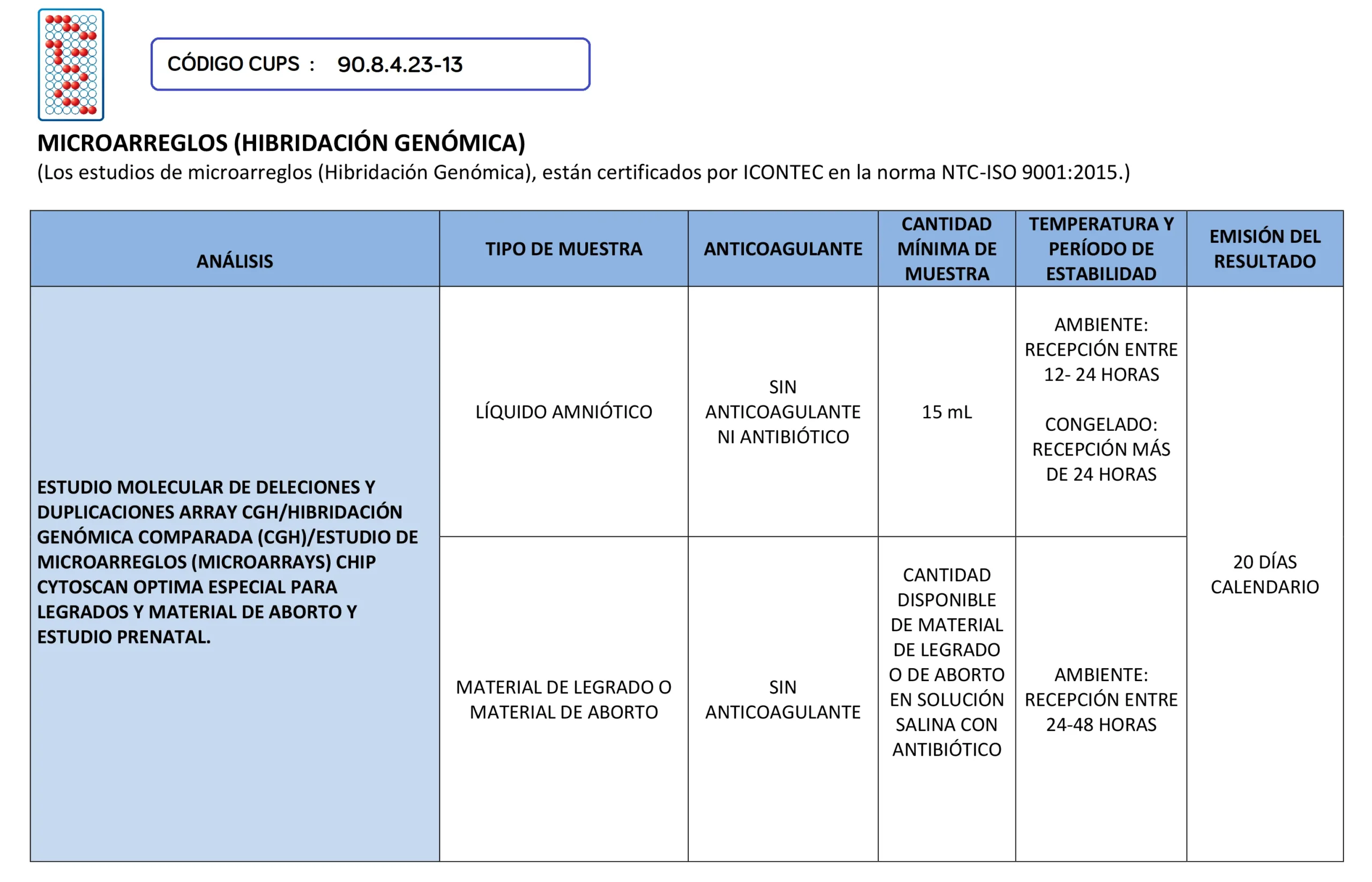 p 39 – ESTUDIO MOLECULAR DE DELECIONES Y DUPLICACIONES ARRAY CGH/HIBRIDACIÓN GENÓMICA COMPARADA (CGH)/ESTUDIO DE MICROARREGLOS (MICROARRAYS) CHIP CYTOSCAN CITOSCAN OPTIMA ESPECIAL PARA LEGRADOS Y MATERIAL DE ABORTO Y ESTUDIO PRENATAL. 90.8.4.23-13