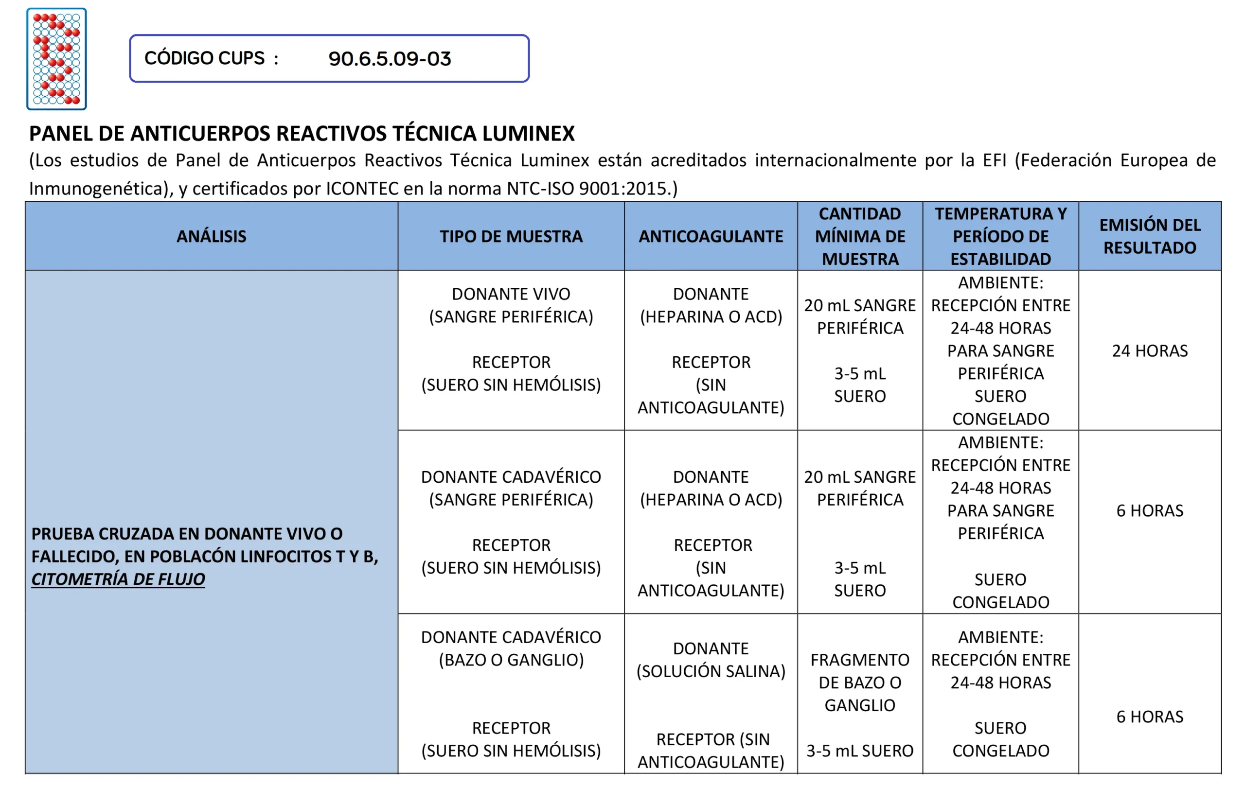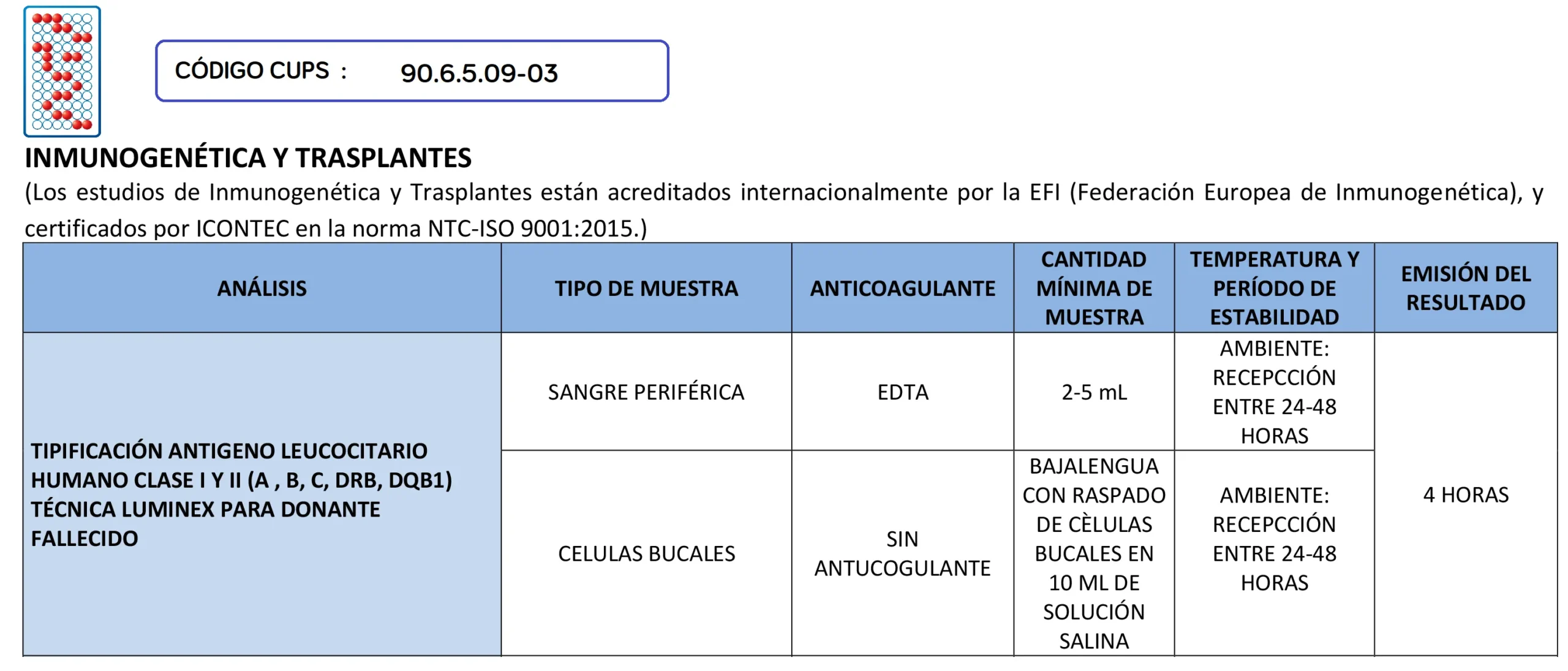 p55-1 TIPIFICACIÓN ANTIGENO LEUCOCITARIO HUMANO CLASE I Y II (A , B, C, DRB, DQB1) TÉCNICA LUMINEX PARA DONANTE FALLECIDO 90.6.5.09-03